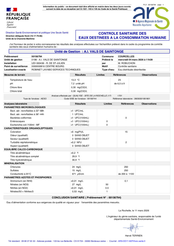 ARS: dernière analyse eau potablePar Jacques TORCHEUX / 13 mars 2026 Facebook Twitter LinkedIn Email Imprimer