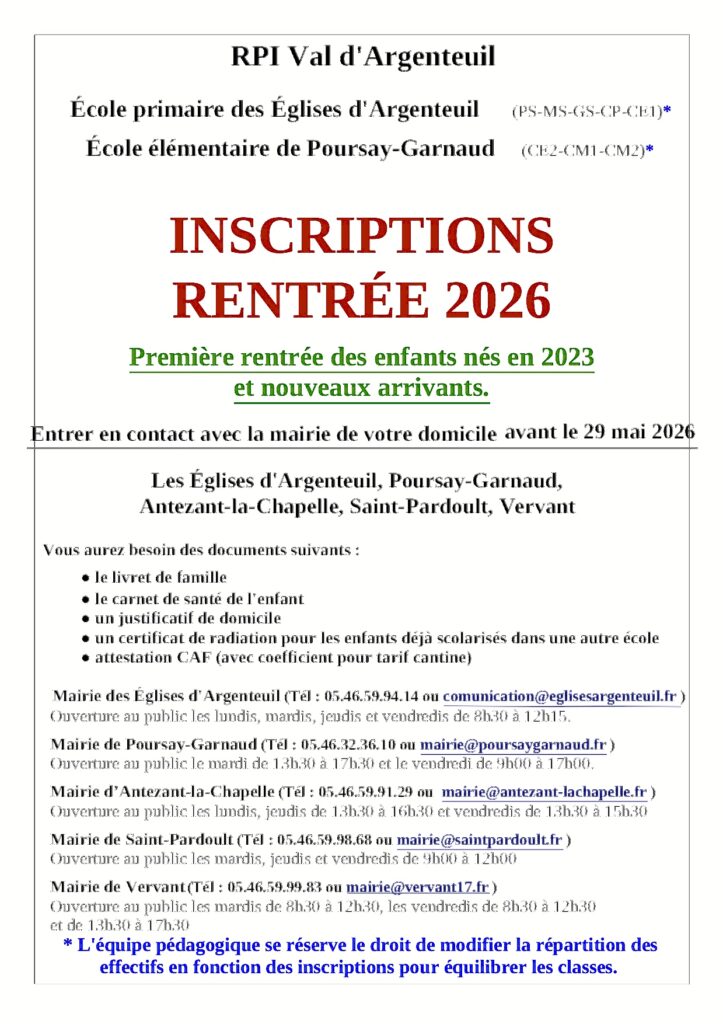 INSCRIPTIONS pour la rentrée scolaire 2026/2027Par Jacques TORCHEUX / 29 avril 2026 Facebook Twitter LinkedIn Email Imprimer